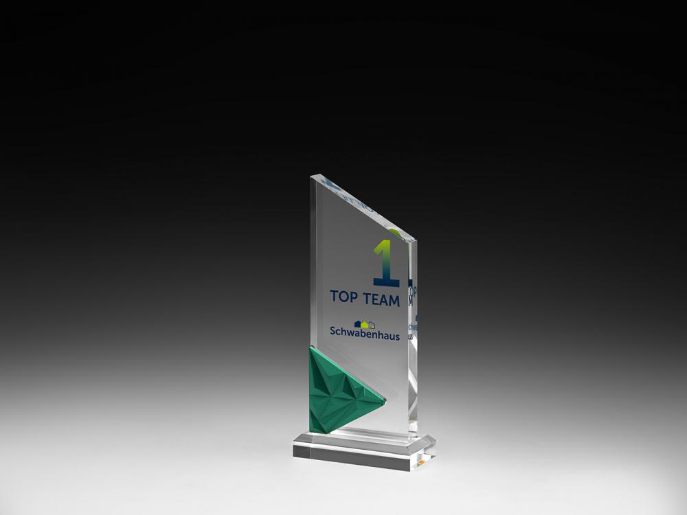 Kantig und nach oben geöffnet, aus klarem Acrylglas mit präzisem, dreidimensionalem Dreiecksmuster. Die facettierte Struktur verleiht diesem Award eine ambitionierte und moderne Wirkung.