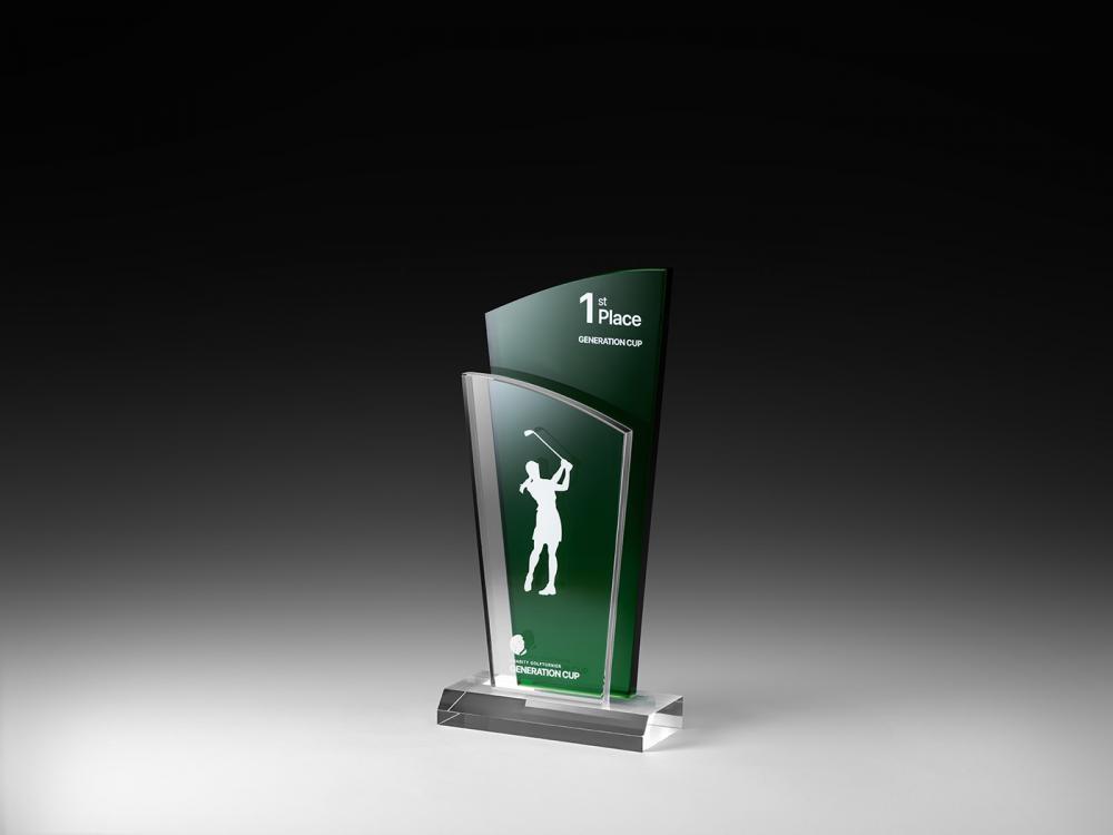 Der Emerald Twin kombiniert klares Acrylglas mit grünem Acrylglas in 10mm Stärke. Ein ausdrucksstarker Award mit ausgewogener Präsenz.