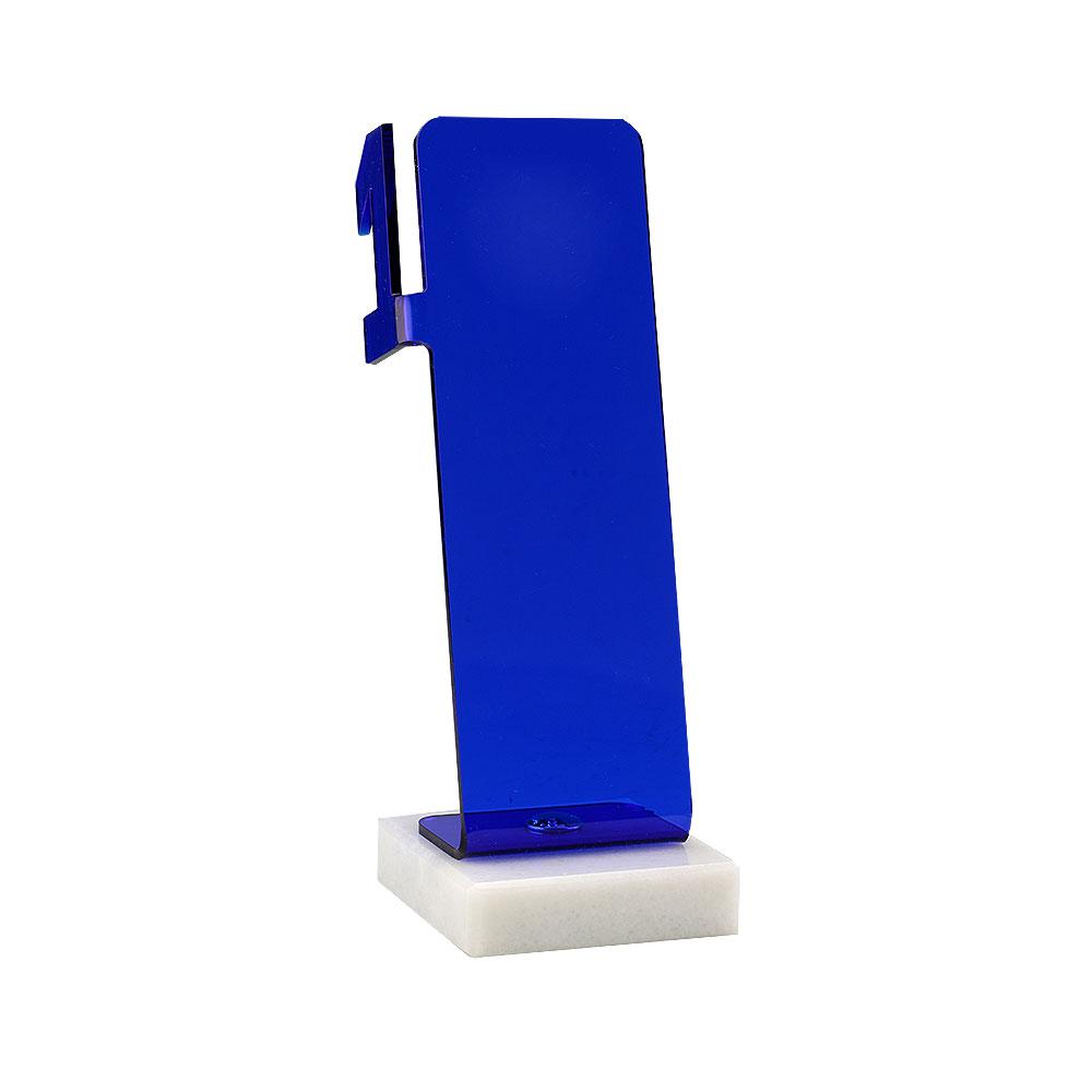 Blaues Acrylglas mit einer gebogenen 1 auf der Seite auf Marmor Sockel.