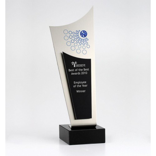 Ideal für Ehrungen: Metalltrophäen aus schwarz eloxiertem Aluminium und fein geschliffenem Aluminium. Das schwarz eloxierte Material kann per Laser beschriftet und personalisiert werden. Logos sind für die Lasergravur kein Problem. Die Trophäen stehen auf einem schwarzen Metallsockel. Modern gestaltete, leichte Trophäen für das kleine Budget.