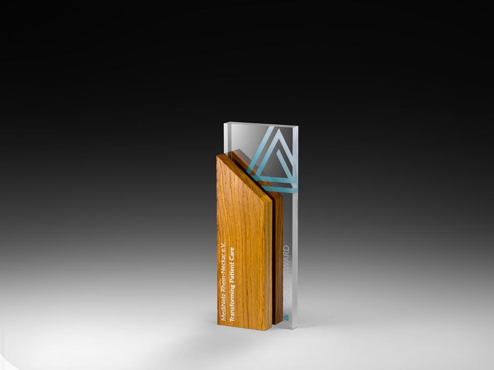 Das klare Acrylglas erzeugt Spannung und eine dynamische Silhouette, eingebettet zwischen Eichenholz. (0,5kg).