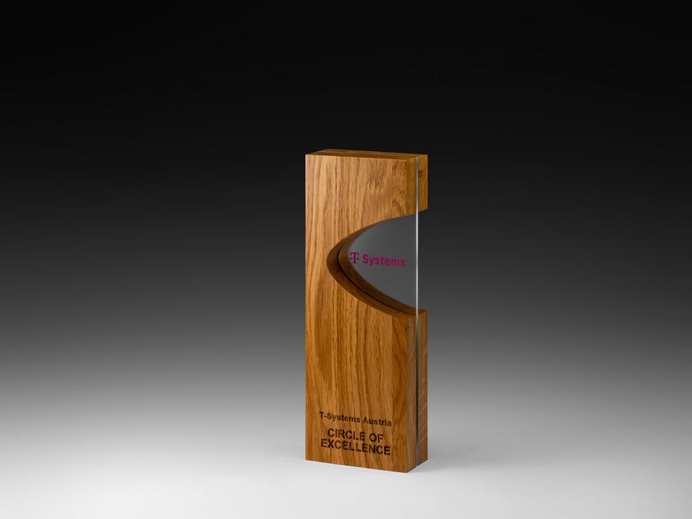 Kraftvoll im Kern: Massives Eichenholz trifft auf klares Acrylglas und schafft eine markante, aufrechte Präsenz.
