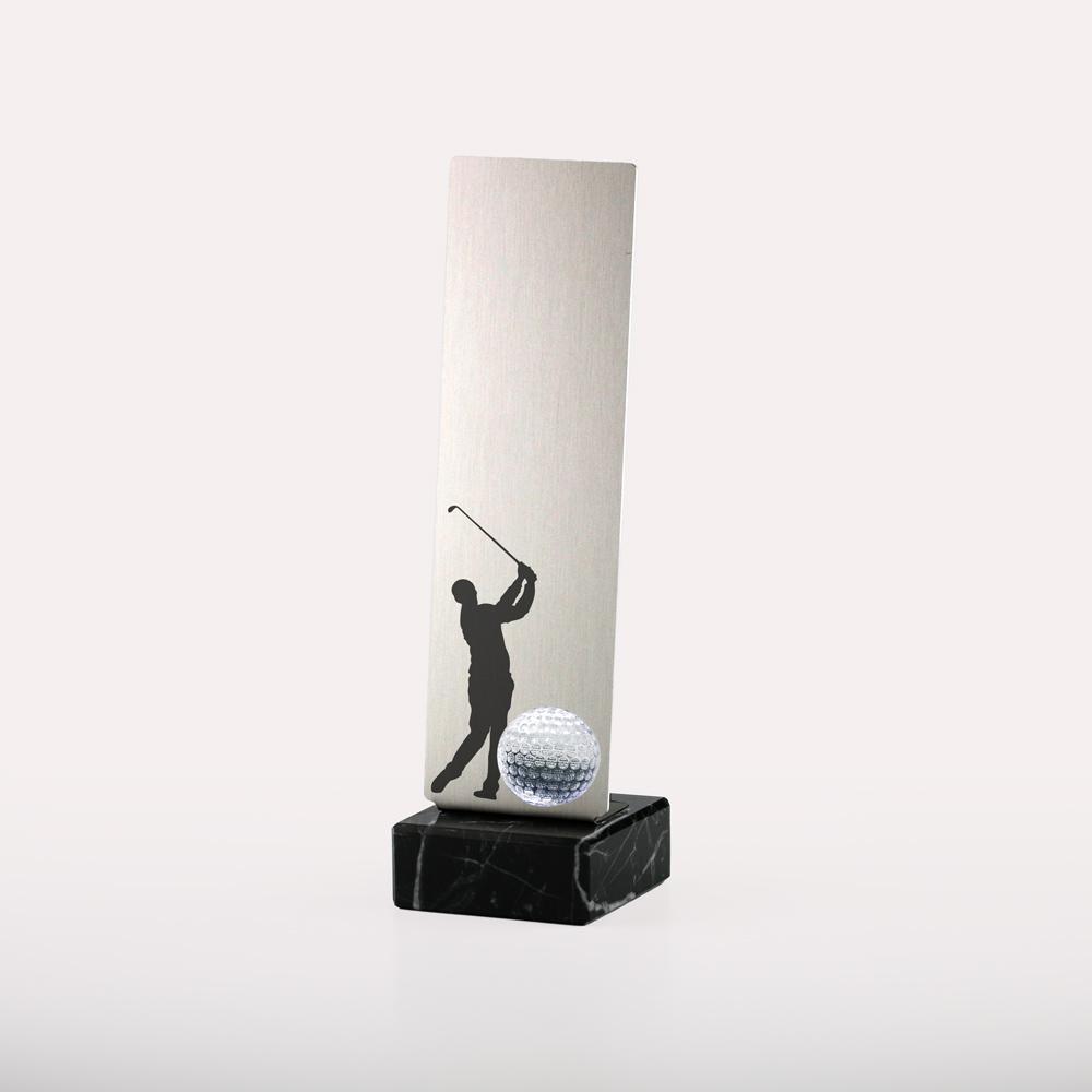 Trophäe, Aluminiumplatte, 1,5 mm stark , Eloxalqualität auf Marmorsockel 8x8x3 cm inkl. Golfer und Golfballinse 4cm D