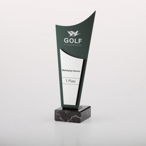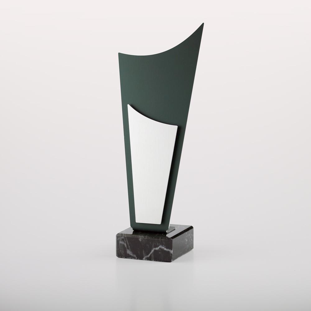 Trophäe, 2tlg., Aluminium, 15 mm stark, grün und silberfarben, Eloxalqualität, beide oben nach innen gebogen auf Sockel 8x8x3 cm